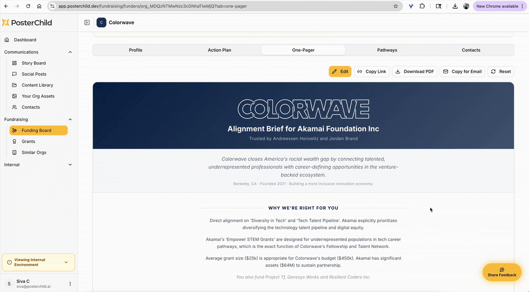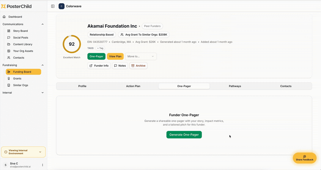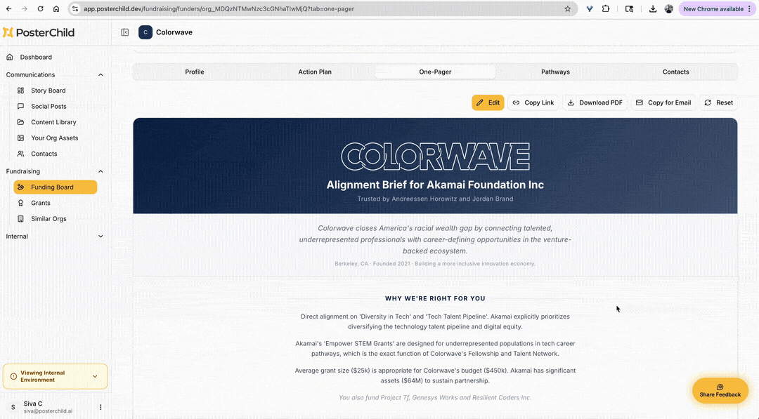 Open any funder, click Generate One-Pager. We pull your stories, impact metrics, and alignment data into a branded document.